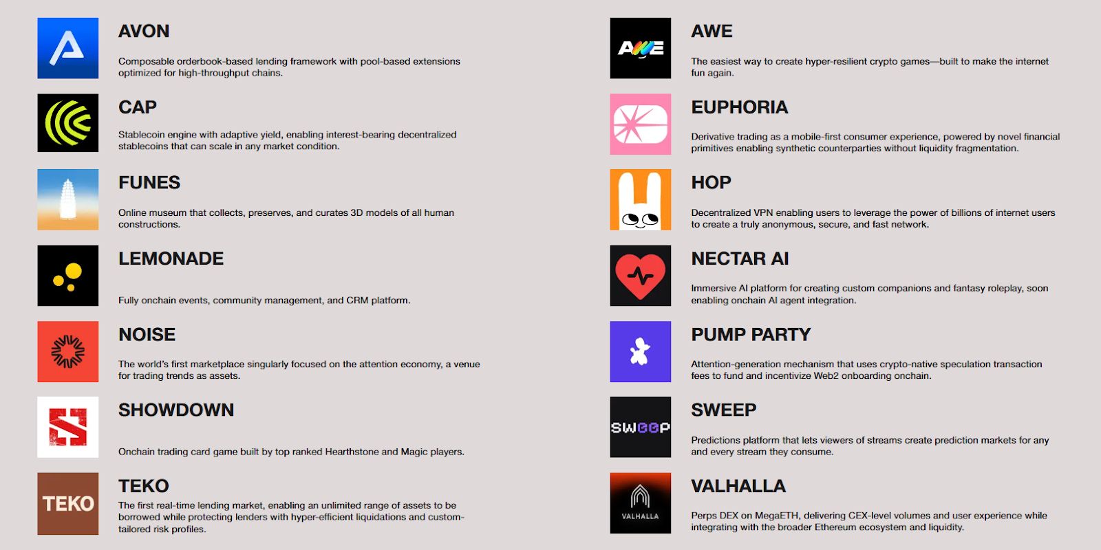 MegaETH มีโครงการ Accelerate Builder ชื่อ “MegaMafia” ที่จะคอยช่วยเหลือ Builder ที่มาพัฒนา dApps บน MegaETH โดยมี dApps ที่น่าสนใจดังนี้